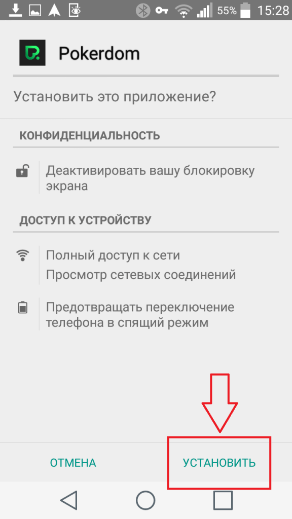 Найдите на телефоне файл apk от рума, откройте и нажмите на «Установить». Программа-установщик в автоматическом режиме выполнит инсталляцию игрового клиента. Спустя несколько минут в меню устройства появится фирменный ярлык покер-рума.